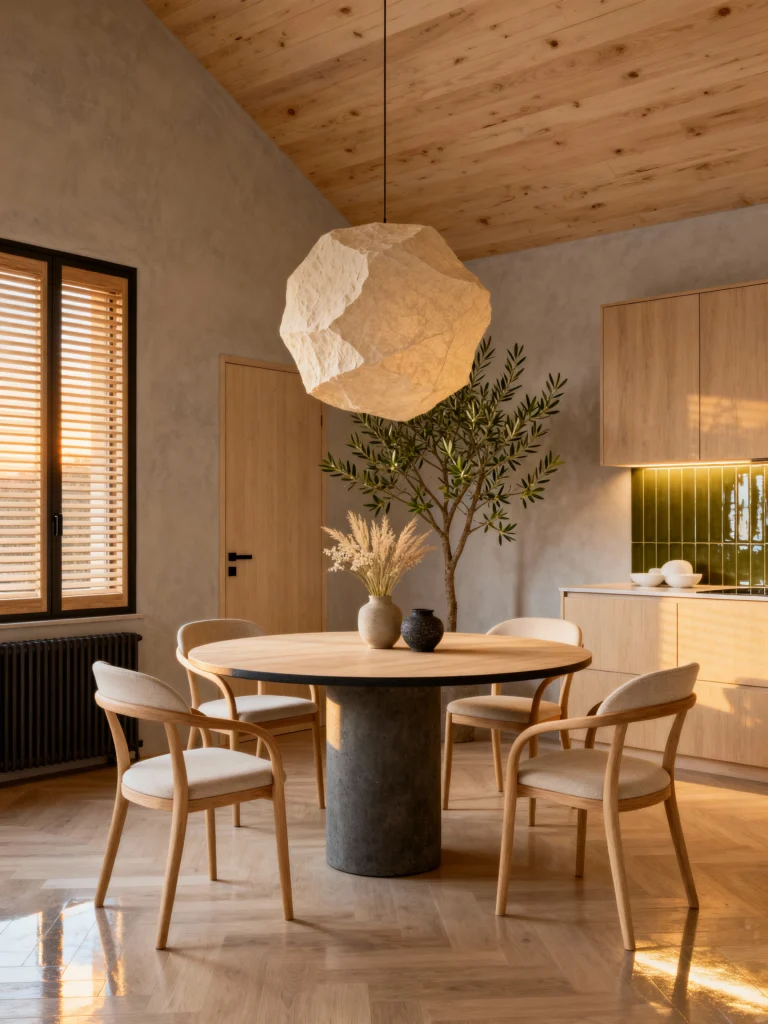 There is something so incredibly calming about a round table. It’s the ultimate “everyone is equal” setup, isn’t it? In this space, the first thing that grabs you is that massive, rock-like pendant light. It looks less like a lamp and more like a piece of floating art. It balances out the smooth, concrete-look pedestal base of the table.