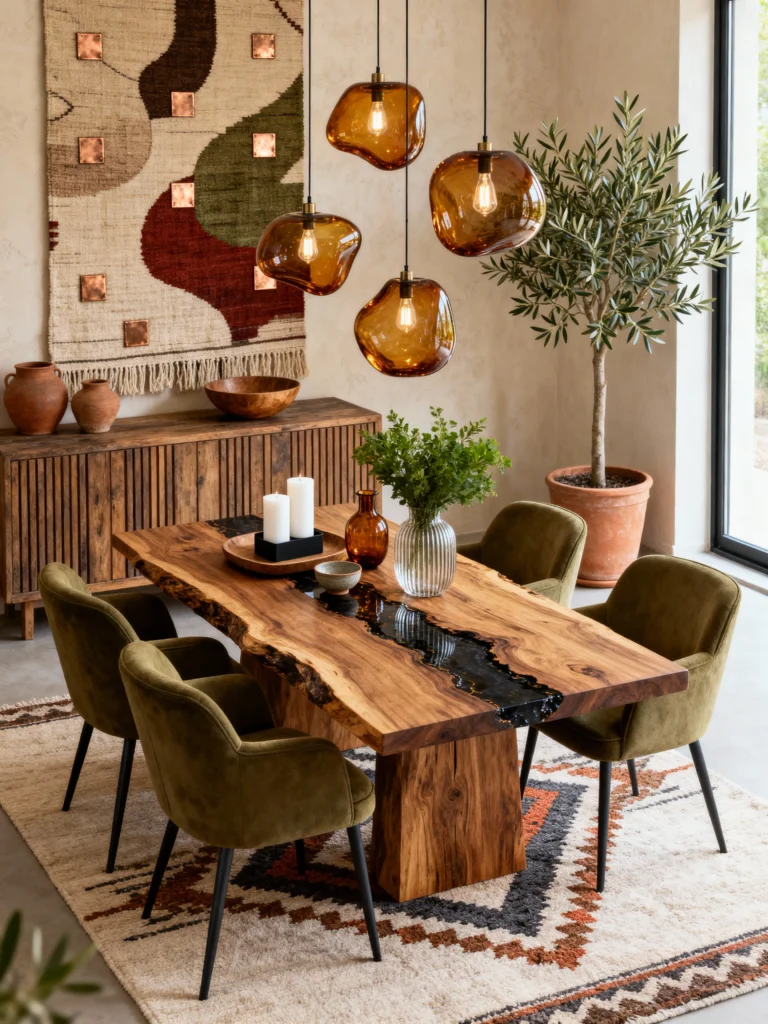Ending on a high note with this rich, textured sanctuary. Those amber glass pendant lights are stunning—they look like glowing honey. The table is the real hero here, with that dark “river” running through the wood grain.