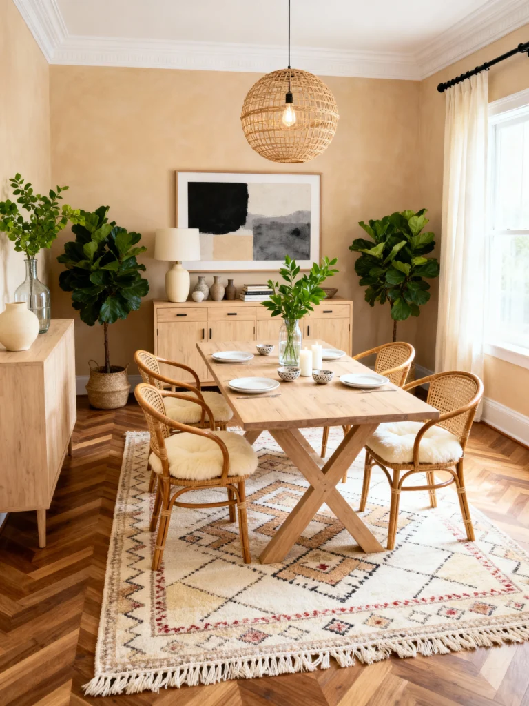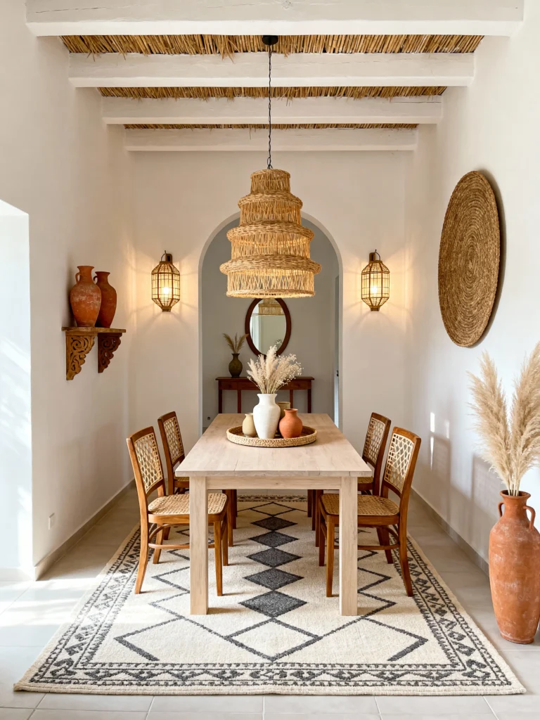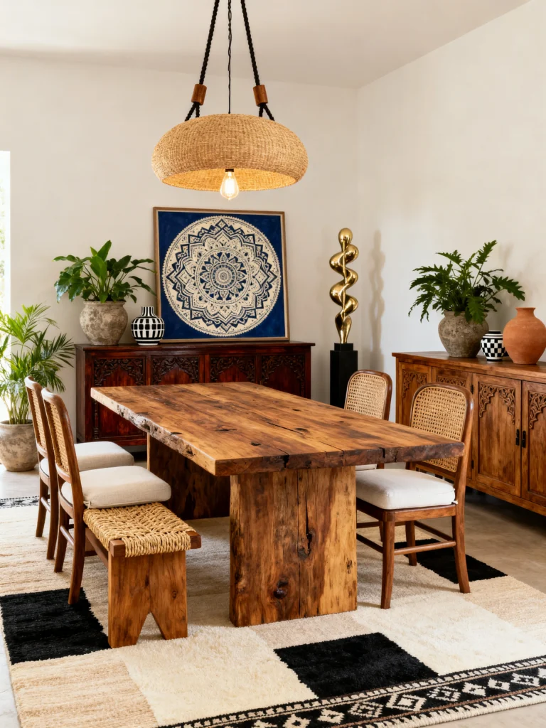 The seating is a fun mix—cane-back chairs on one side and a rustic wooden bench with a woven top on the other. This mix-and-match approach makes the room feel relaxed and unpretentious. The large basket-style pendant light casts a soft, patterned glow over the whole space. It’s a room that celebrates craftsmanship and global patterns, making every meal feel like a special occasion.