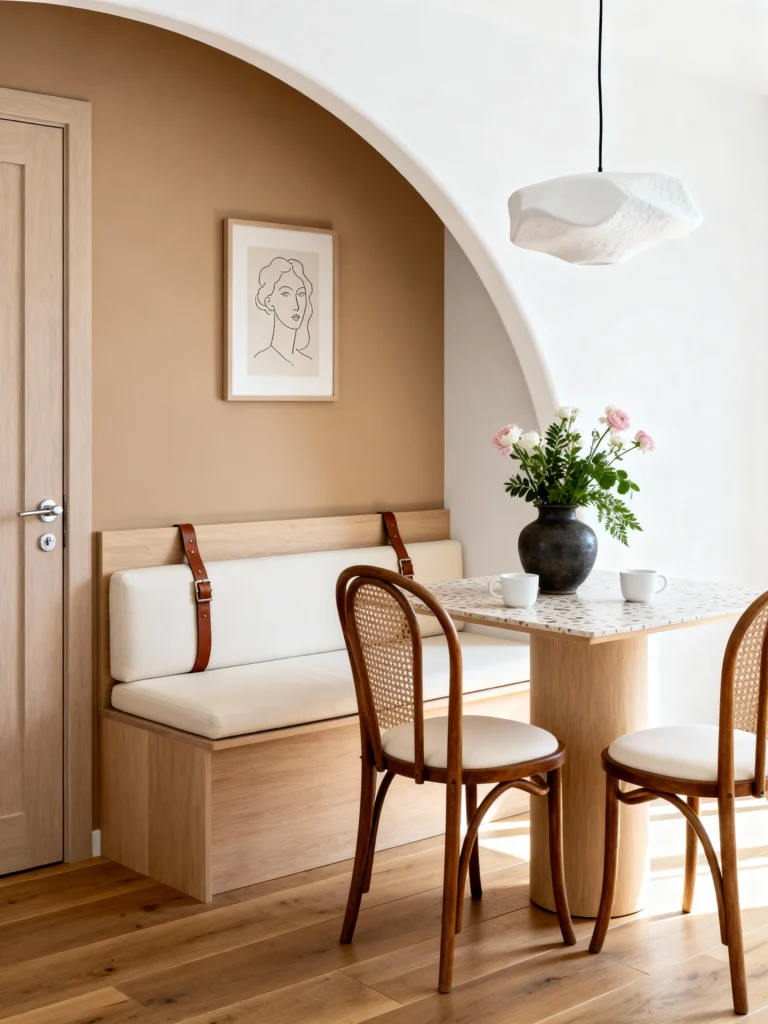 Not everyone has a massive dining hall, and this image is proof that a small corner can be the chicest spot in the house. This breakfast nook is tucked under a stunning architectural arch, which makes it feel like its own little world. The built-in bench (or banquette) is a huge space-saver, and those leather straps holding the back cushions? That’s the kind of detail that makes a space look expensive.