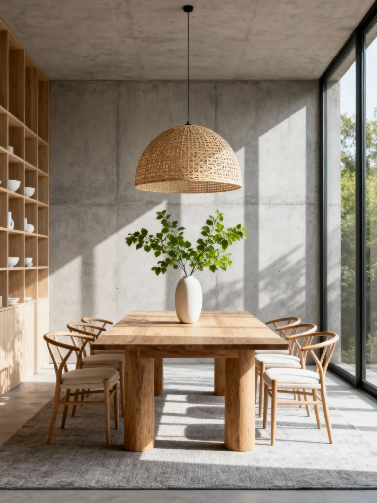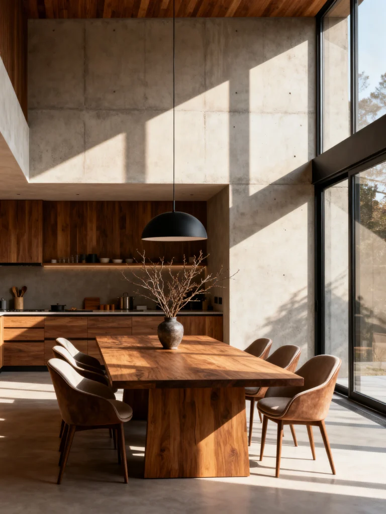 This is for my fans of architecture and drama. This room is all about the intersection of concrete and wood. The soaring concrete walls give it a “gallery” feel, but the rich, warm walnut wood of the kitchen cabinets and the dining table keeps it feeling like a home. The lighting here is very intentional—a simple matte black dome that directs light straight onto the table, creating an intimate “pool” of light in a large, high-ceilinged room.