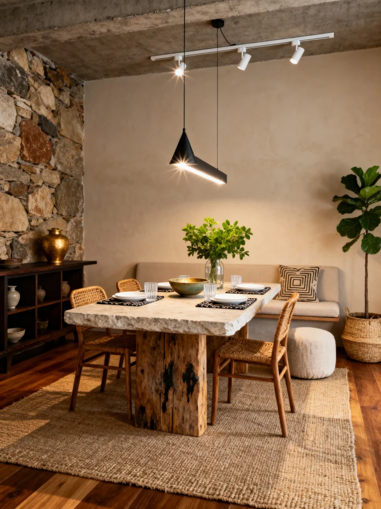 The lighting here is a total “wow” moment. That tiered, cream-colored pendant looks like a piece of sculpture hanging from the ceiling. And check out the centerpiece—a raw, stone bowl. It’s a great reminder that you don’t always need flowers; sometimes a beautiful, heavy object is all the styling a table needs. This room is all about high-contrast textures: smooth wood, rough stone, soft fur, and woven grass.