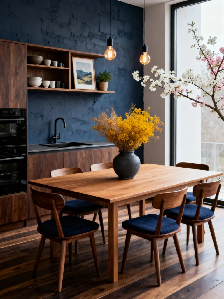 The simplicity of the table allows the details to shine, like the cherry blossom branch reaching in from the side and the bright yellow dried flowers on the table. It’s a high-contrast color palette: Navy, Gold, and Warm Wood. The exposed filament bulbs hanging from the ceiling add a bit of an industrial touch without feeling too “workshop.” This is a sophisticated “grown-up” dining room if I’ve ever seen one.