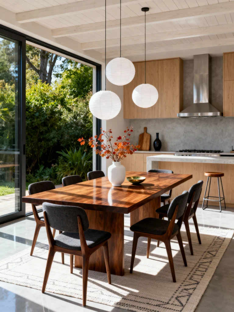 The dark wood table is the anchor here. It’s heavy and solid, which makes the white rug and the light-colored kitchen cabinets pop. I love the addition of the autumn-colored branches in the vase; it’s a tiny pop of orange that ties in with the wood tones without feeling forced. It’s a space designed for long, sunny brunches.