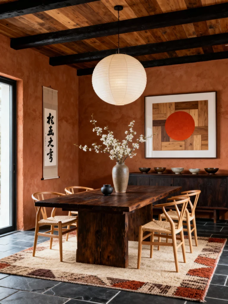 Wow, talk about a mood! This room is for the person who isn’t afraid of a little drama. Those deep, earthy terracotta walls are everything. They make the space feel incredibly cozy and lived-in. The dark, heavy timber beams on the ceiling give it a rustic, almost cabin-like feel, but then you have those iconic Wishbone chairs to keep it sophisticated.