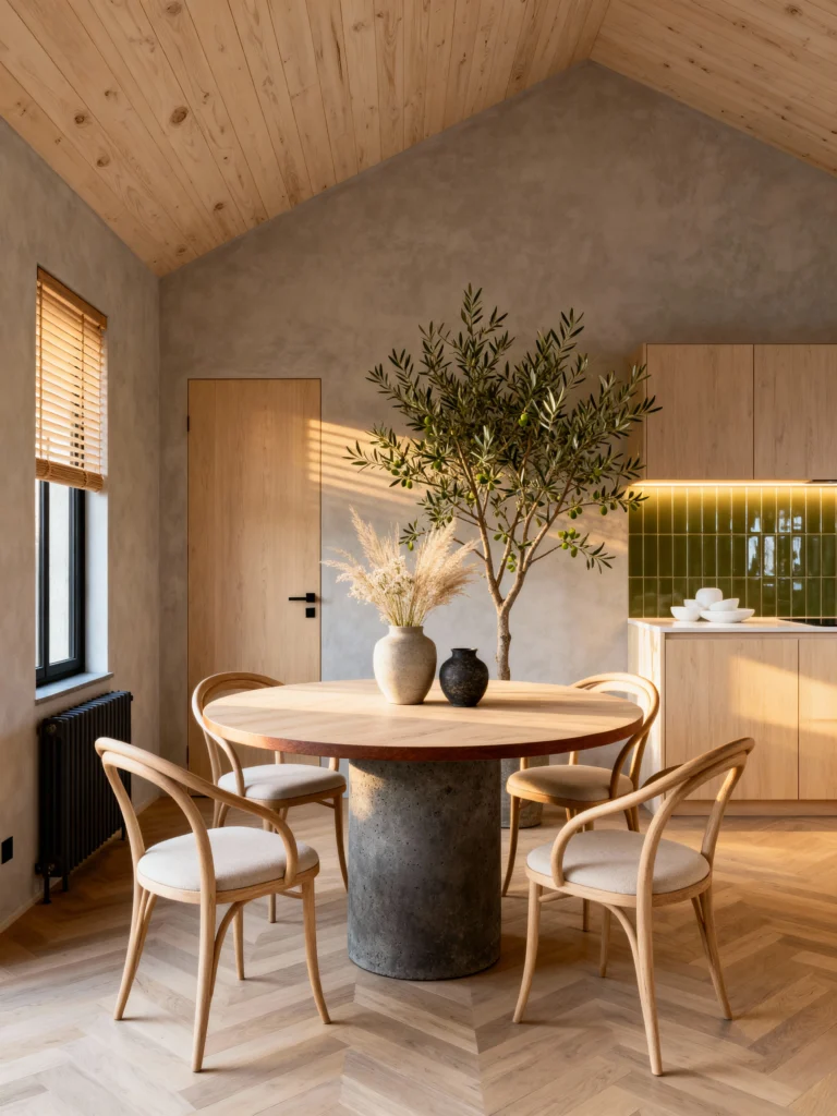 Notice how the warmth of the wood-slat ceiling plays against those soft gray walls? It’s a masterclass in texture. The chairs are light and airy, and that olive tree in the corner adds just the right amount of organic life. If you want a room that feels like a deep breath, this is it. It’s modern, but it doesn’t feel cold—it feels intentional.