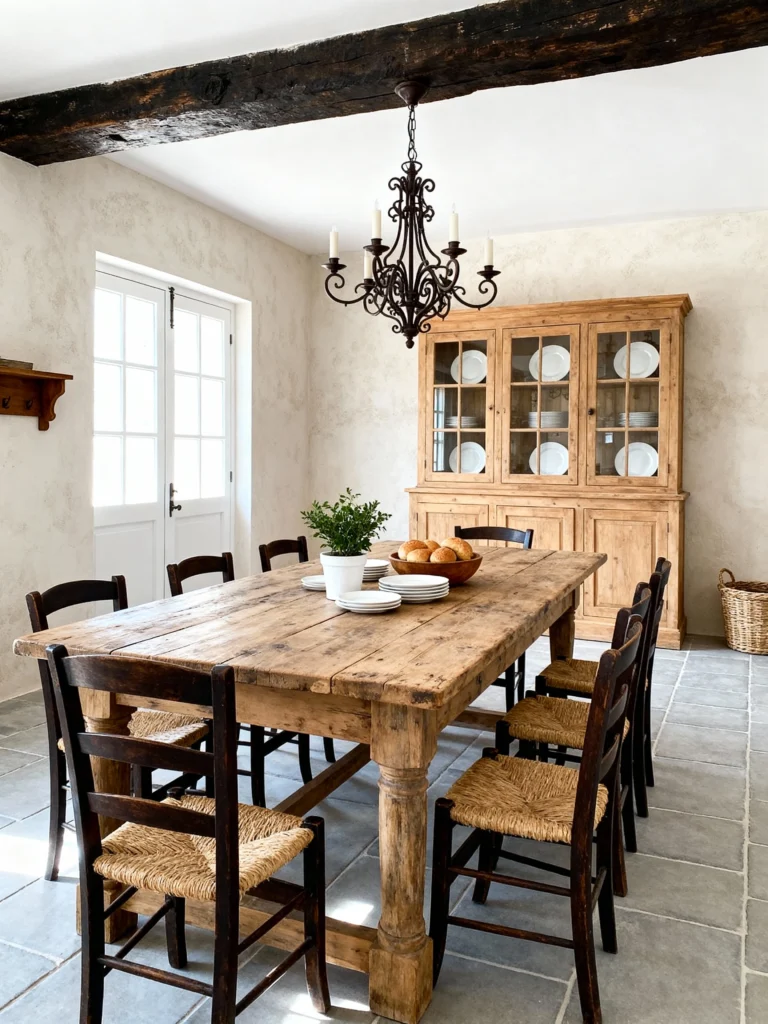 This is for the traditionalists at heart. That massive, chunky wooden table looks like it has stories to tell. I love that it’s paired with a delicate, dark metal chandelier—it’s that “refined meets rugged” look that never goes out of style.