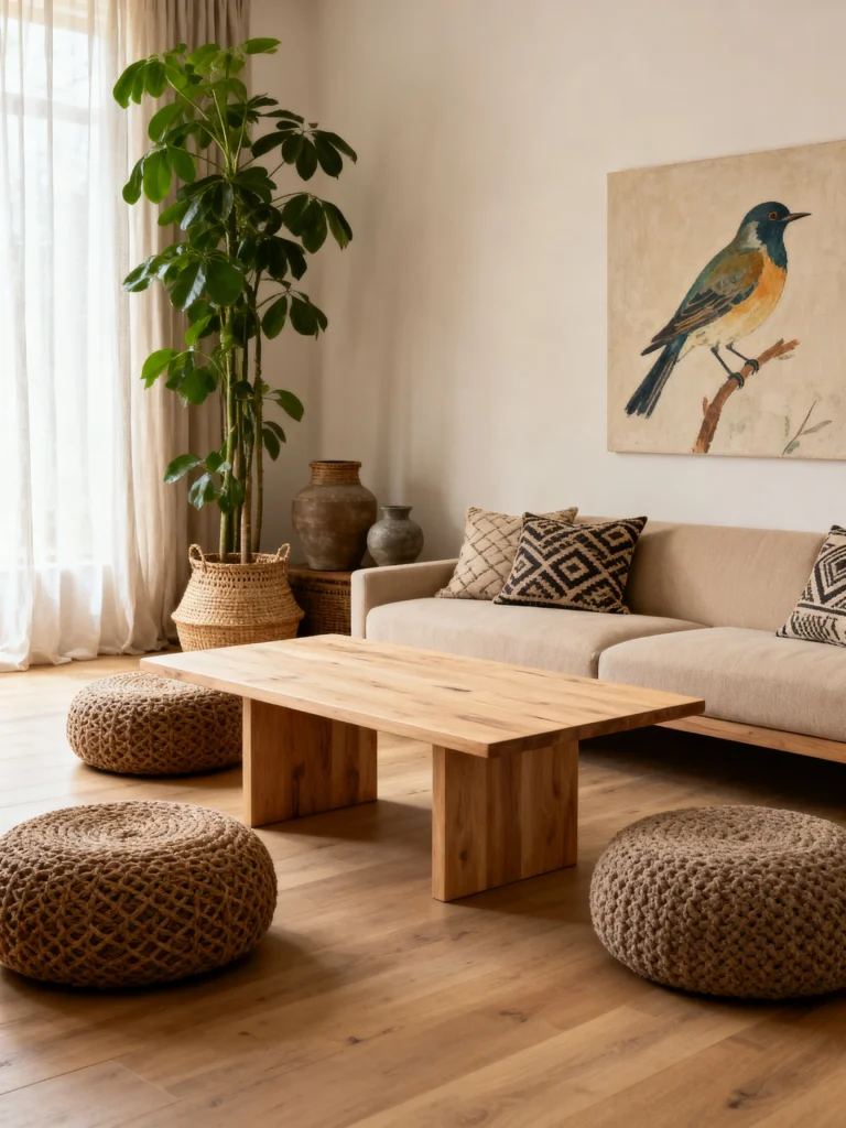 The use of woven poufs instead of a traditional second sofa or bulky armchairs is a genius move. They provide extra seating when you have friends over but keep the room feeling open and casual. Plus, they add a great “chunky” texture that plays off the smooth wooden coffee table.