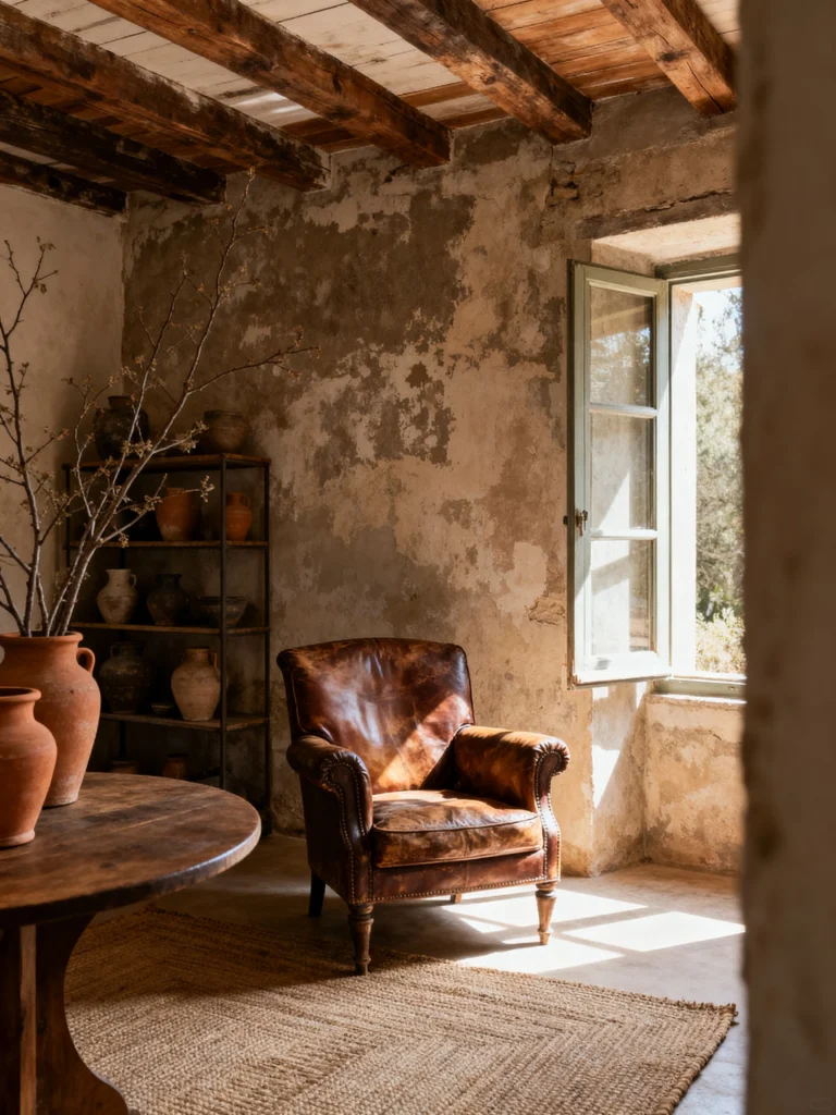 There is something so honest about a room that doesn’t try to hide its age. Looking at this space, the first thing that hits you is that incredible wall. It’s not “damaged”—it’s seasoned. The way the plaster peels back to reveal layers of history is the ultimate nod to Wabi-Sabi.