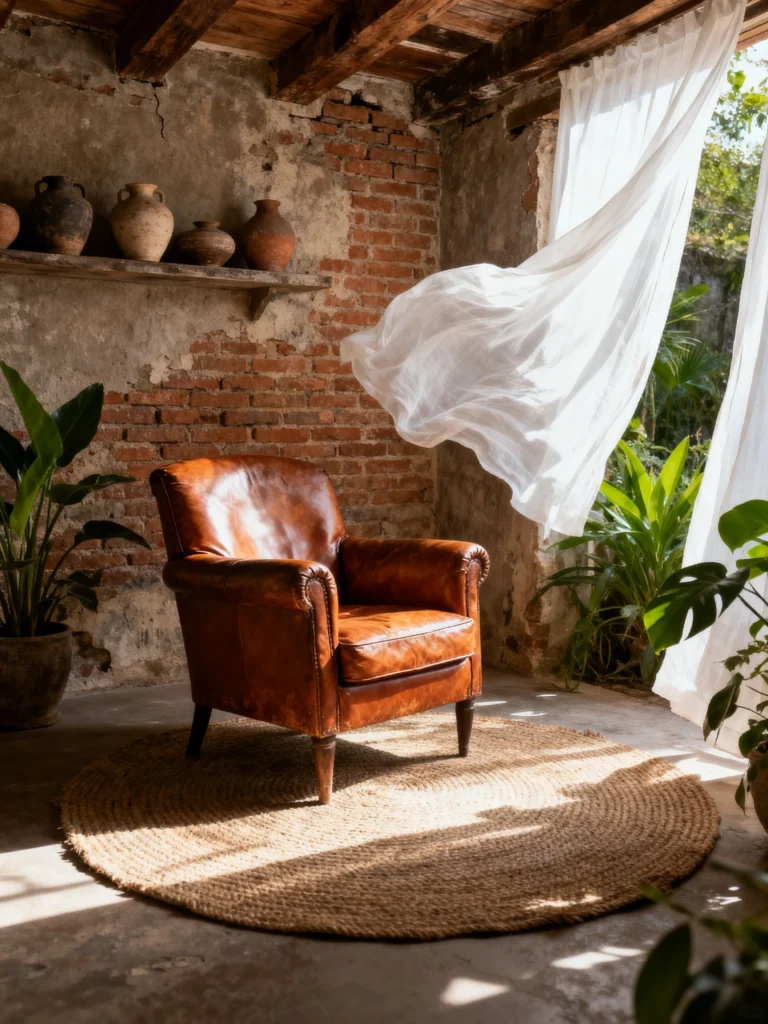 The backdrop of exposed red brick against the crumbling plaster creates a gorgeous industrial-meets-Mediterranean feel. It’s a bit “ruin-chic,” and I am here for it. The circular jute rug is the perfect anchor—it breaks up the straight lines of the brick and the floor, adding a layer of organic texture that feels great underfoot.