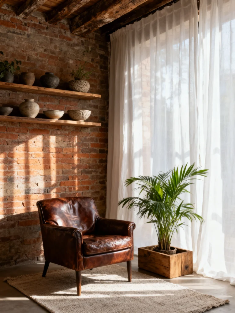 The sheer curtains are doing a lot of heavy lifting here, too. They filter the sunlight so it hits the brick in soft streaks rather than harsh glares. This is the ultimate “reading nook.” You have the light, the comfort, and the beautiful things to look at when you look up from your book. It’s simple, it’s quiet, and it’s perfect.