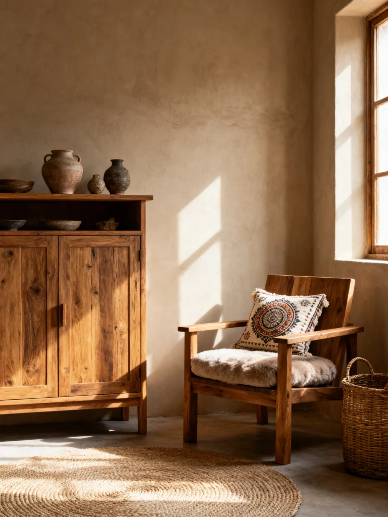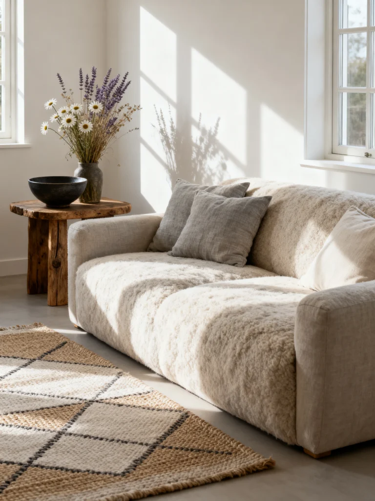 The pairing of the sheepskin-like texture with the geometric, woven rug creates a sophisticated “Scandi-Boho” look. I love the little wooden side table—it’s basically just a polished stump, which brings that necessary bit of “raw nature” back into the mix.