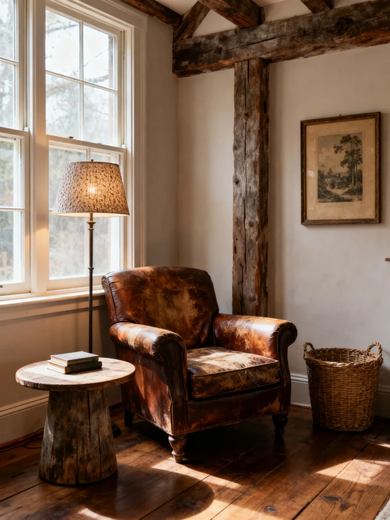 The lighting here is what makes it feel so special. The textured lampshade on the floor lamp diffuses the light into a warm, amber glow that highlights the patina on the leather chair. It’s the ultimate “evening” spot. Can’t you just imagine sitting here with a glass of scotch and an old leather-bound book?