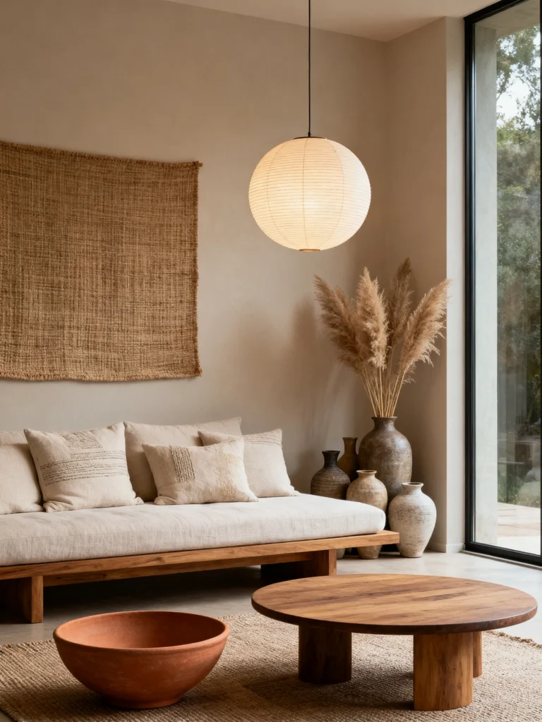Let’s talk about “Modern Wabi-Sabi.” This room is much cleaner and more minimal, but it still feels incredibly warm. The star of the show is that oversized paper globe pendant light. It’s like having a little moon hanging in your living room. It provides a soft, even light that makes all the beige and cream tones feel rich and buttery.