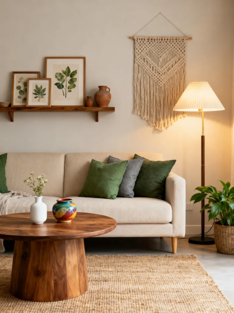 The low-profile wooden sofa (almost like a daybed) is very Japanese-inspired. By keeping the furniture low to the ground, the room feels much larger and more peaceful. The wall hanging—a simple piece of textured burlap or woven grass—is a great alternative to traditional framed art. It adds soul without adding “noise.”