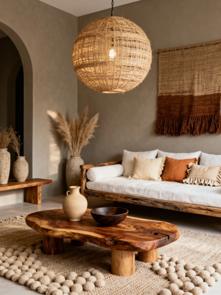 If I could live inside a texture, it would be this one. This room is a love letter to jute, linen, and raw timber. The first thing your eye hits is that oversized woven pendant light. It’s basically a giant ball of texture that anchors the whole room. It’s a great reminder that lighting isn’t just about the bulb; it’s about the shadow play and the material.