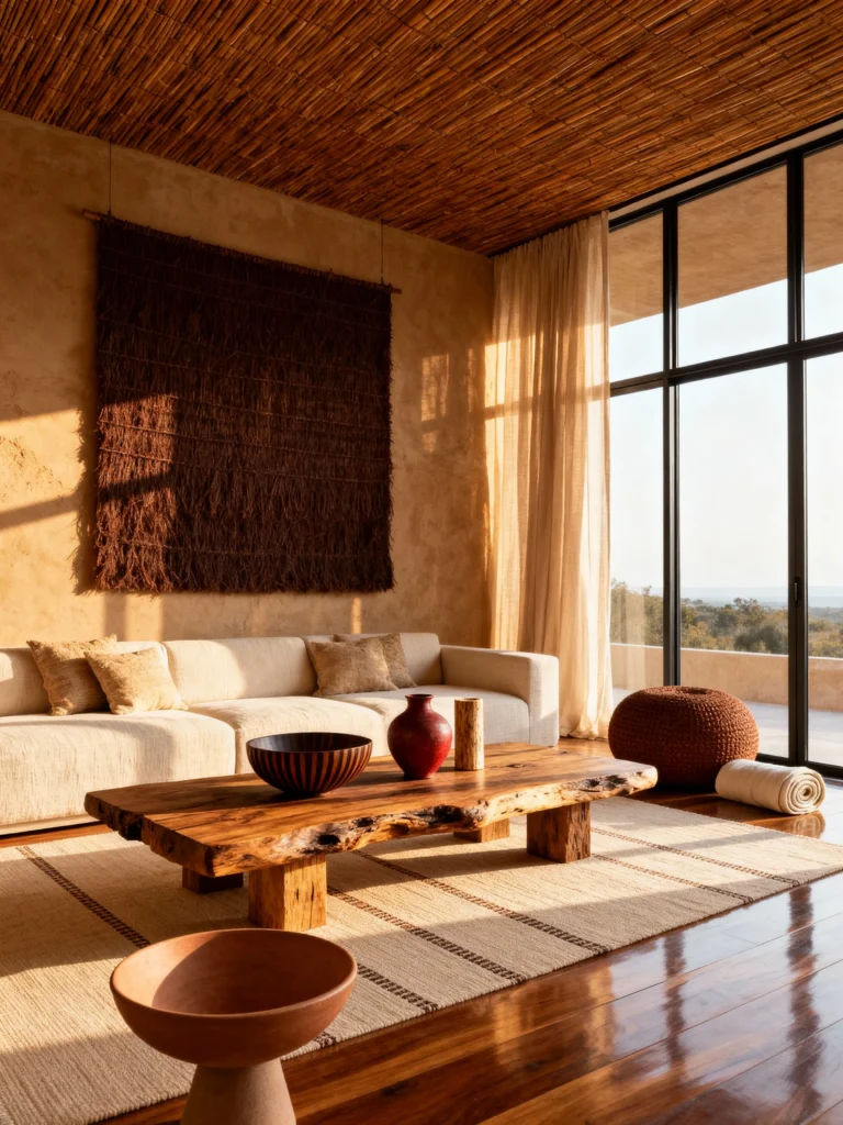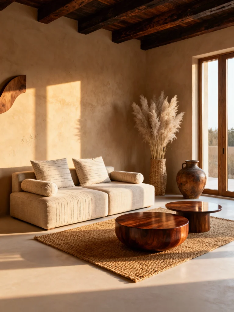 The tall woven vase with the feathery grass in the corner adds height without being “heavy.” It draws your eye up to the dark wooden ceiling beams, which provide the perfect “lid” to the room. It’s a very balanced space—nothing feels crowded, and every piece has room to breathe.