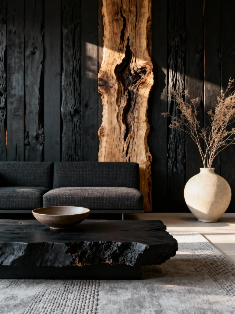 The coffee table follows suit—it’s a massive, heavy slab of wood that’s been charred to a deep black, showing off all the cracks and gnarls of the grain. It feels ancient and modern at the same time. By keeping the sofa a dark charcoal gray, the furniture almost blends into the wall, making the whole room feel like one continuous, moody landscape.