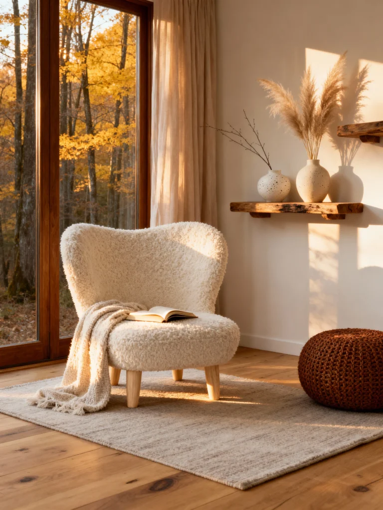 If “cozy” was a picture, this would be it. That “Sherpa” or “Bouclé” chair looks like a literal cloud. It’s the kind of chair that begs you to grab a book and stay for three hours. The curved back is super inviting, and the light wood legs keep it feeling modern.