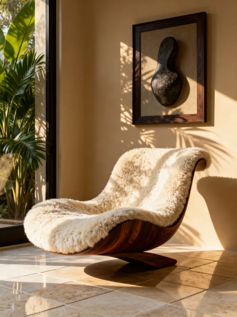 This is more than a room; it’s an art gallery. That chair is a literal work of art—a bentwood frame lined with a thick, plush sheepskin. It looks like it’s floating. It’s a piece that says, “I value design and comfort equally.”
