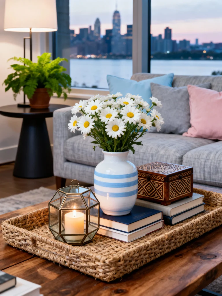 If you have a killer view, you want your coffee table to complement the horizon, not block it. This look is all about texture and height. Using a chunky woven seagrass tray instantly grounds the space and keeps your items from looking cluttered. I love the pop of blue on the vase here—it echoes the water outside while the daisies keep things feeling fresh and unpretentious. The secret weapon? That geometric lantern. It adds a bit of architectural edge that fits a city apartment perfectly.