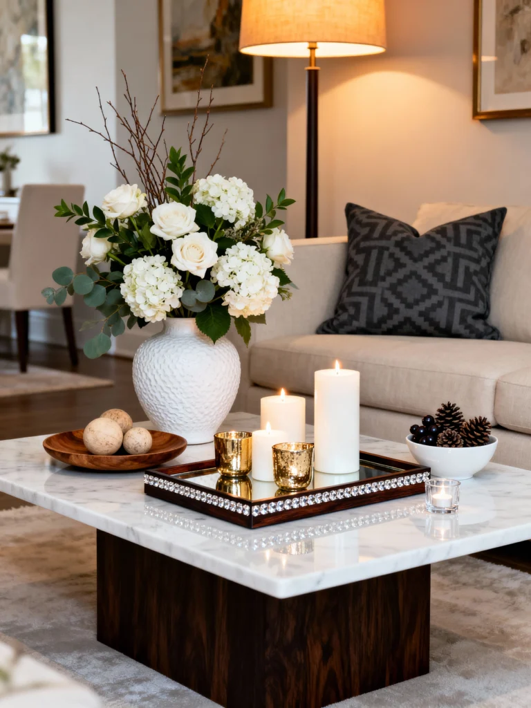 We’re ending with a bang! A white marble table is already a luxury statement, so we’re pairing it with crisp whites and gold. The large white textured vase with hydrangeas and roses is the ultimate classic choice. But look at that tray—it’s rimmed with crystals! By adding a small bowl of pinecones, you bring in a natural element that keeps the “glam” feeling grounded. It’s polished, bright, and totally “Pinterest-worthy.”
