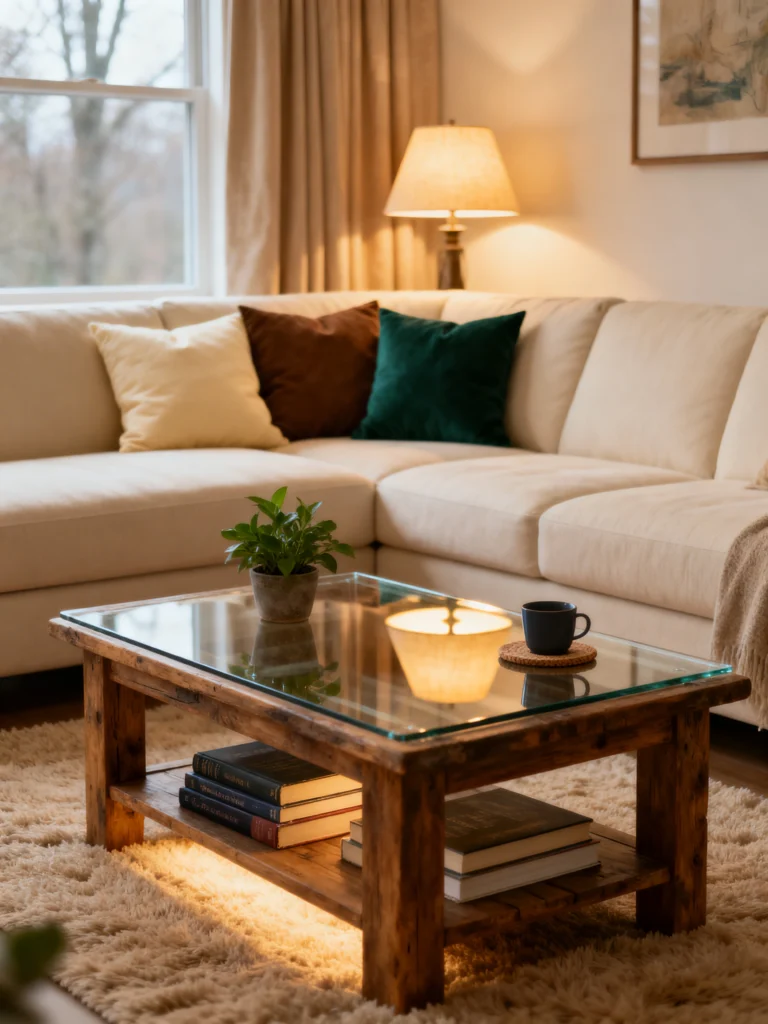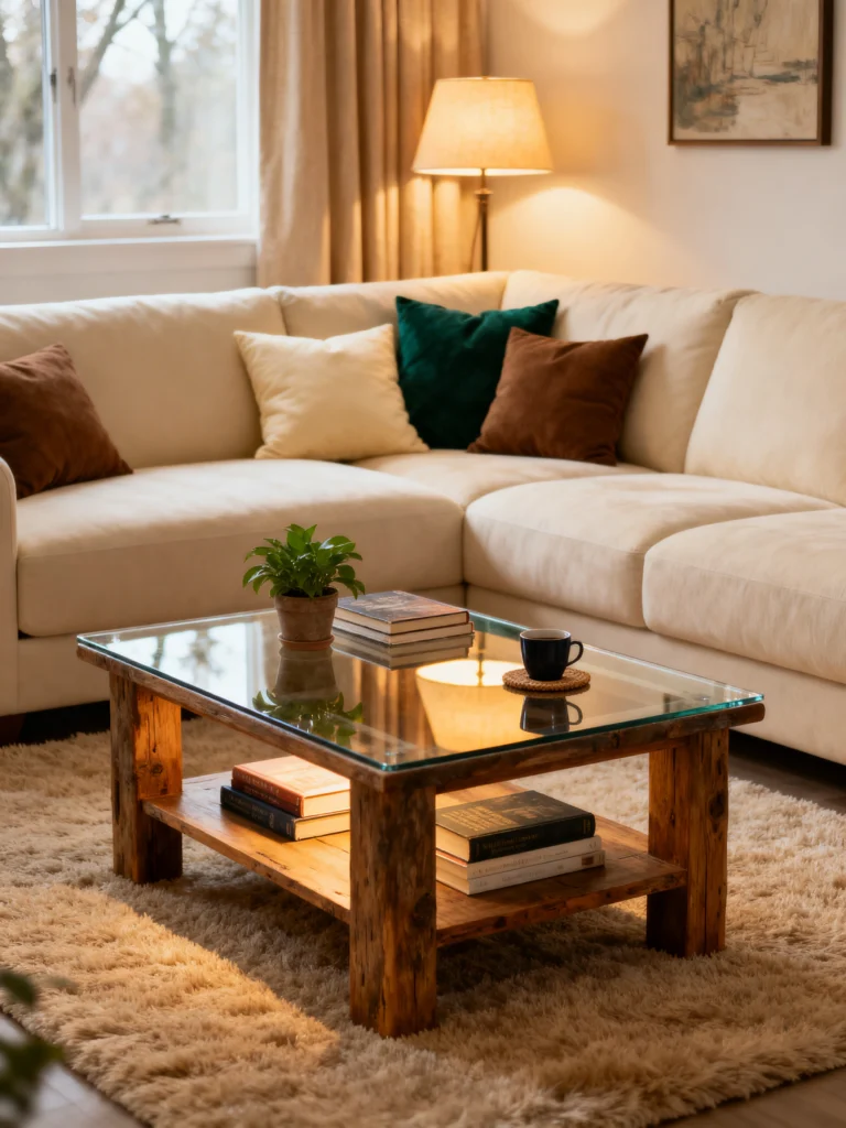 This look is all about that “cozy cabin in the city” energy. What I love about this piece is the contrast—you have these heavy, rugged wooden legs that feel super grounded, but the glass top keeps the room feeling airy. If you have a smaller space, a glass top is a total pro move because it doesn’t visually “clutter” the floor.