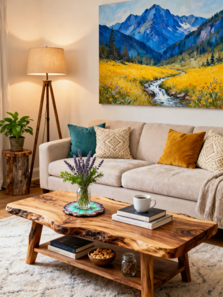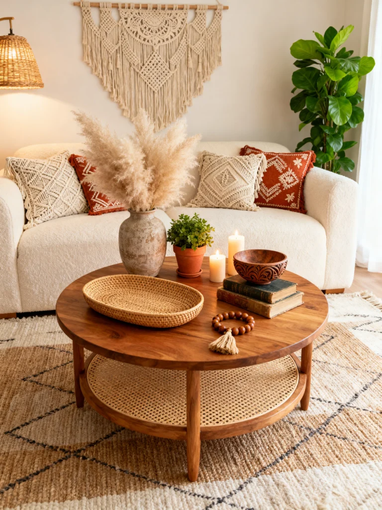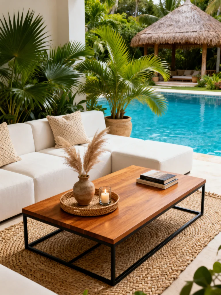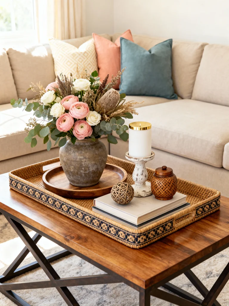 The trick to making a simple table look this high-end is layering. Use a wooden tray to group your smaller items—like succulents or candles—so the table feels organized rather than messy. Combined with that vibrant rug and all those plants, this room feels like a permanent vacation.