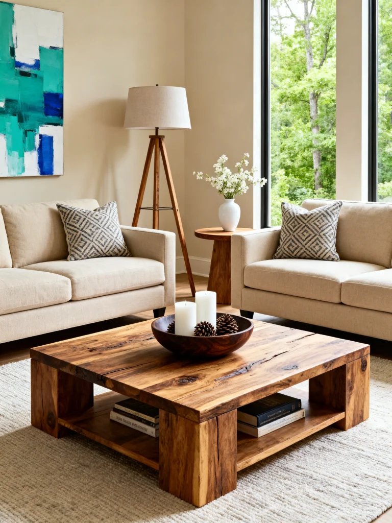 This table is a unit. If you have a large living room with high ceilings, you need a piece of furniture that can hold its own, and this thick-cut wooden table is it. It feels very architectural and solid.