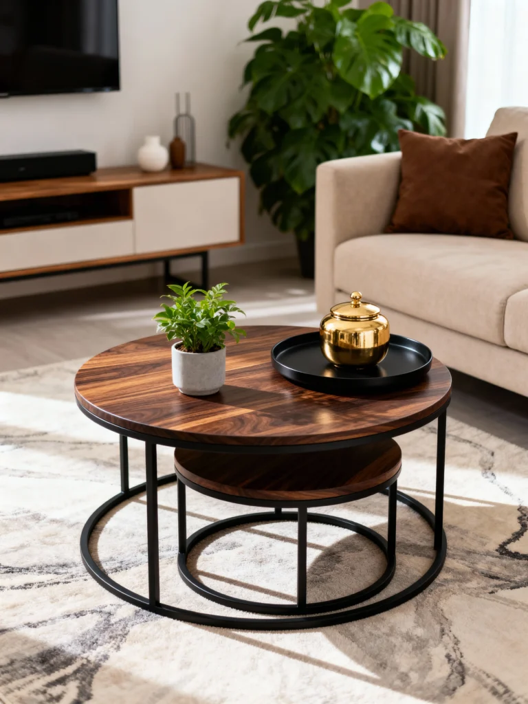 Sometimes, the table itself is the star of the show. With a tiered, circular wooden table like this, you don’t want to over-decorate. We’re going for sleek and intentional. A simple black circular tray provides a “stage” for a single, statement gold canister. It’s chic, it’s expensive-looking, and it leaves plenty of room for your actual coffee. A tiny pop of green in a concrete pot adds just enough life to keep the modern lines from feeling too cold.