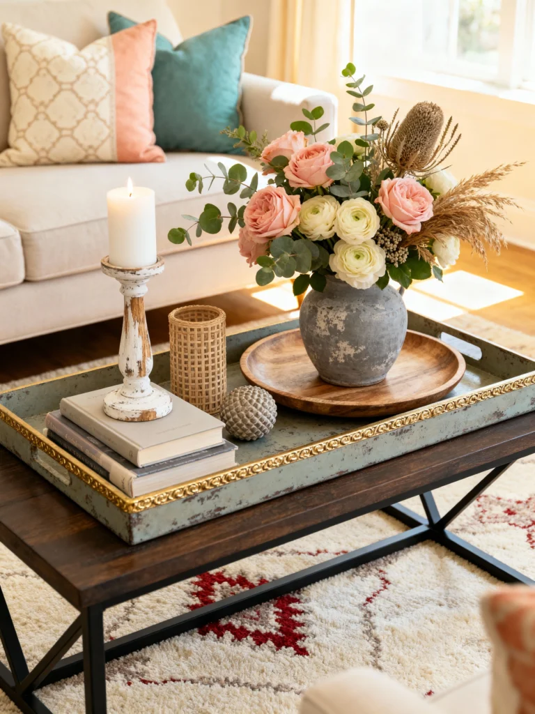 I am obsessed with this look. It’s a bit shabby-chic meets cottage-core. The distressed, sage-green metal tray is the perfect foundation for a romantic arrangement. We’ve got pink roses in a weathered stone jar and a vintage-style white candlestick. It feels like something you’d find in a high-end French farmhouse. It’s cozy, a little bit “undone,” and incredibly welcoming.