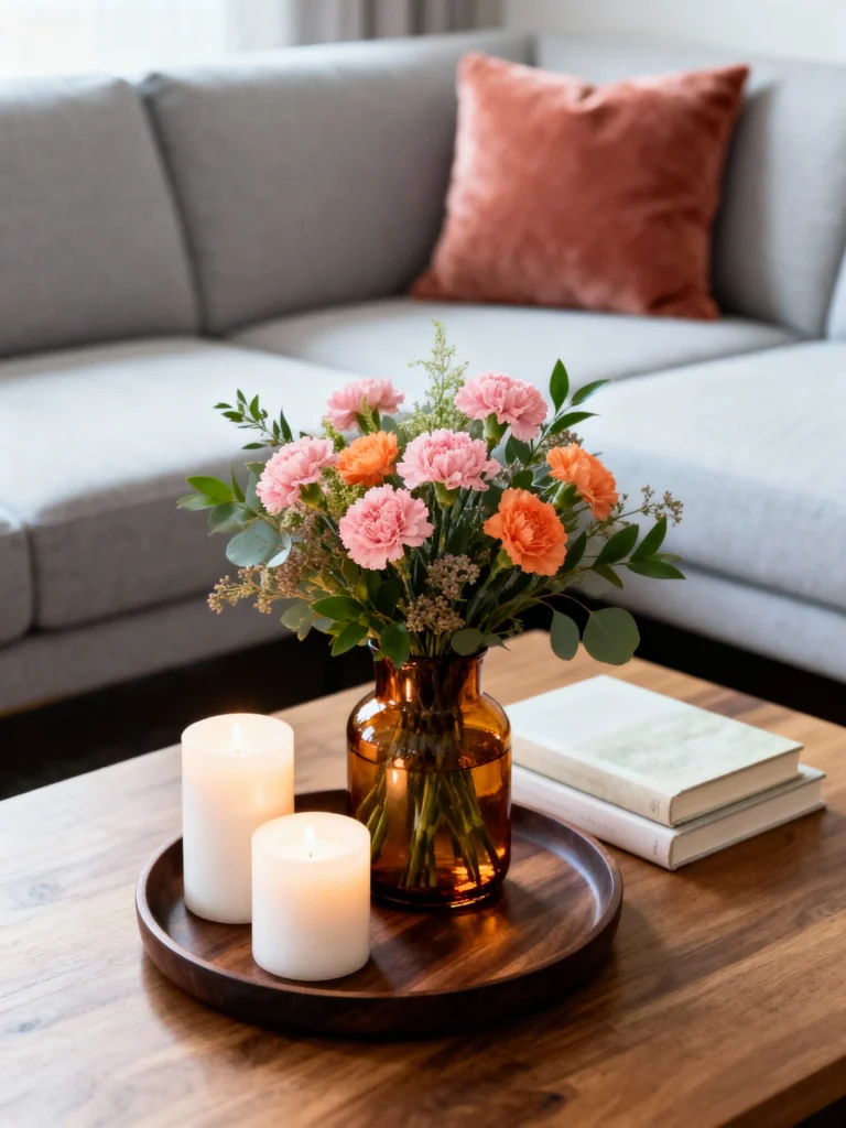 If your living room is your sanctuary for movie nights, this is the setup for you. It’s all about warmth. A simple dark wood tray holds an amber glass vase filled with pink and orange carnations. The amber glass catches the light from those thick pillar candles beautifully. It’s a low-profile arrangement, meaning it won’t get in the way of the TV, but it still makes the room feel “finished.”