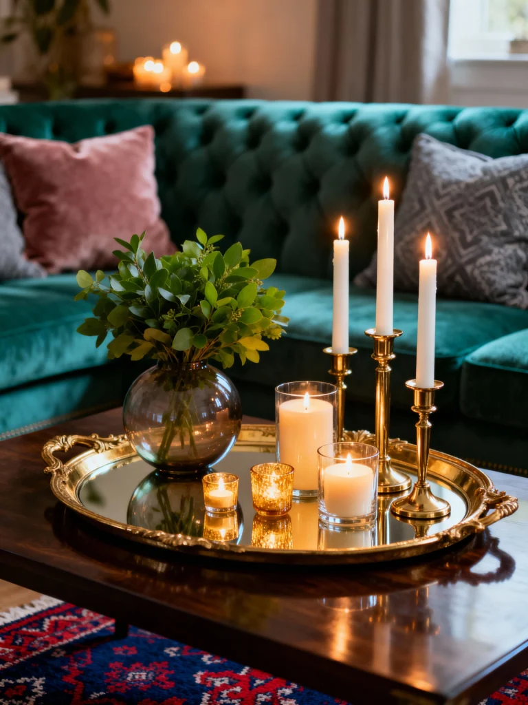 Ready to turn the glam up to eleven? This look uses a mirrored gold tray to bounce light all over the room. If you have a dark or velvet sofa (like that gorgeous emerald green one), gold accents are your best friend. We’ve used multiple heights of candles—tapers in gold holders and pillars in glass—to create a “cityscape” of light. It’s moody, sophisticated, and perfect for a cocktail hour at home.