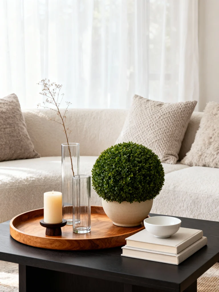 Sometimes, less really is more. On a dark black table, a light wood circular tray creates a striking visual pop. Instead of flowers, we’re using a manicured green topiary ball. It’s clean, symmetrical, and very calming. The tall, thin glass cylinders add a bit of height without adding visual weight. If you want your living room to feel like a high-end spa, this is the direction to go.