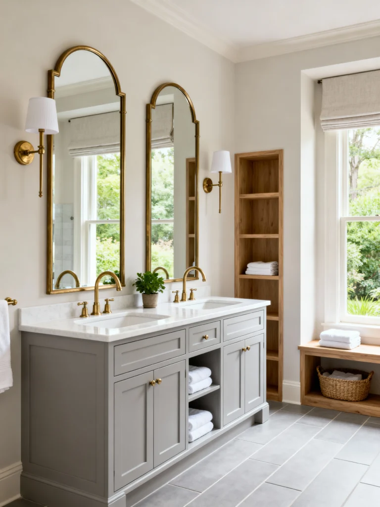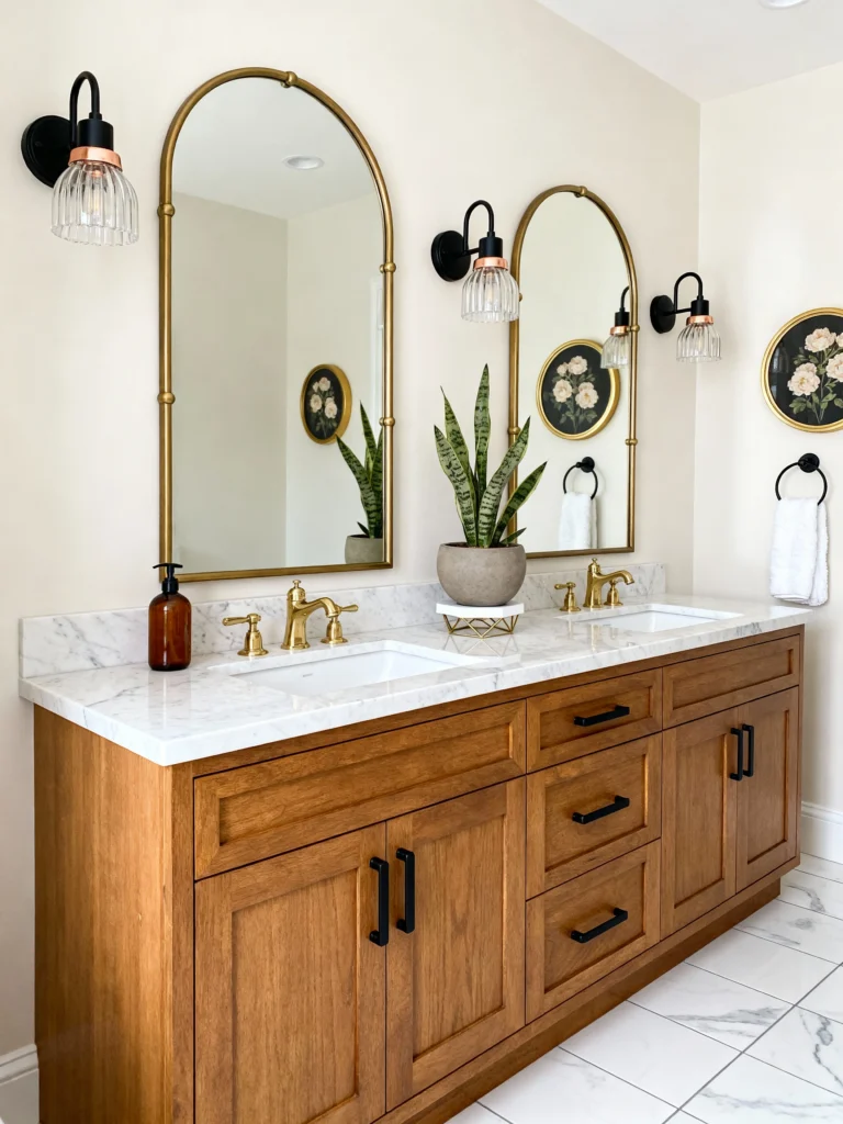 If you’re a fan of mixing “old-world charm” with “modern clean,” this one is for you. The first thing that catches your eye is those gorgeous arched mirrors. They add so much height to the room and make it feel almost like a high-end boutique hotel.