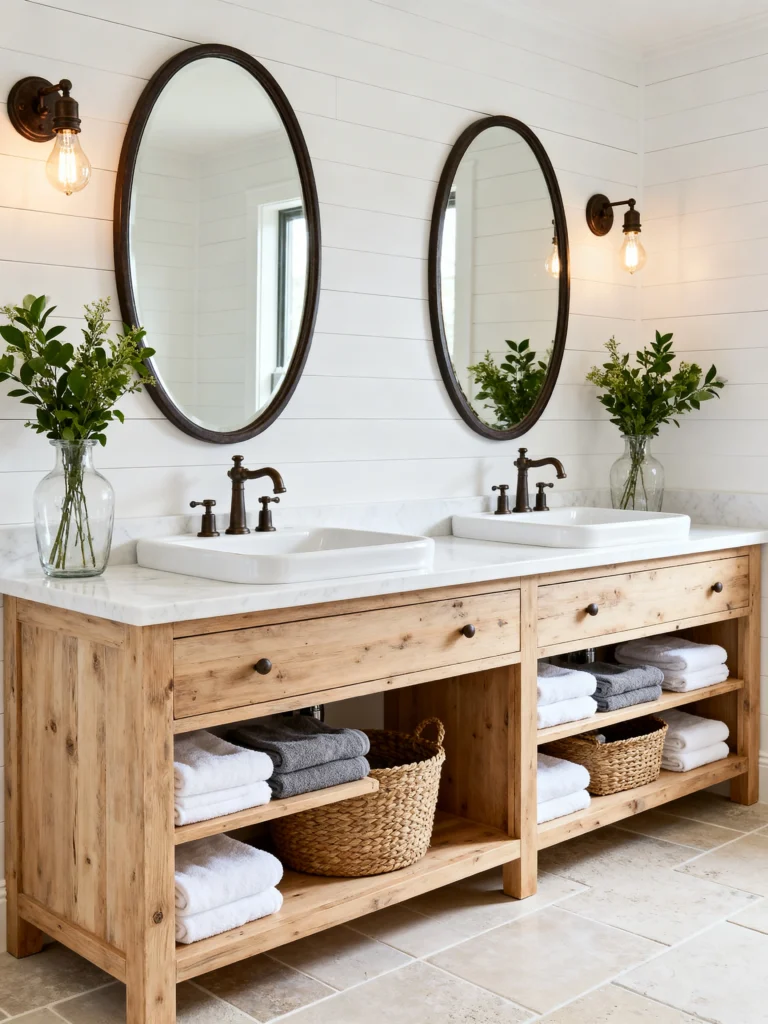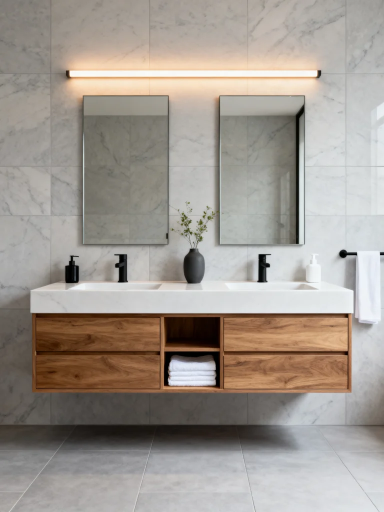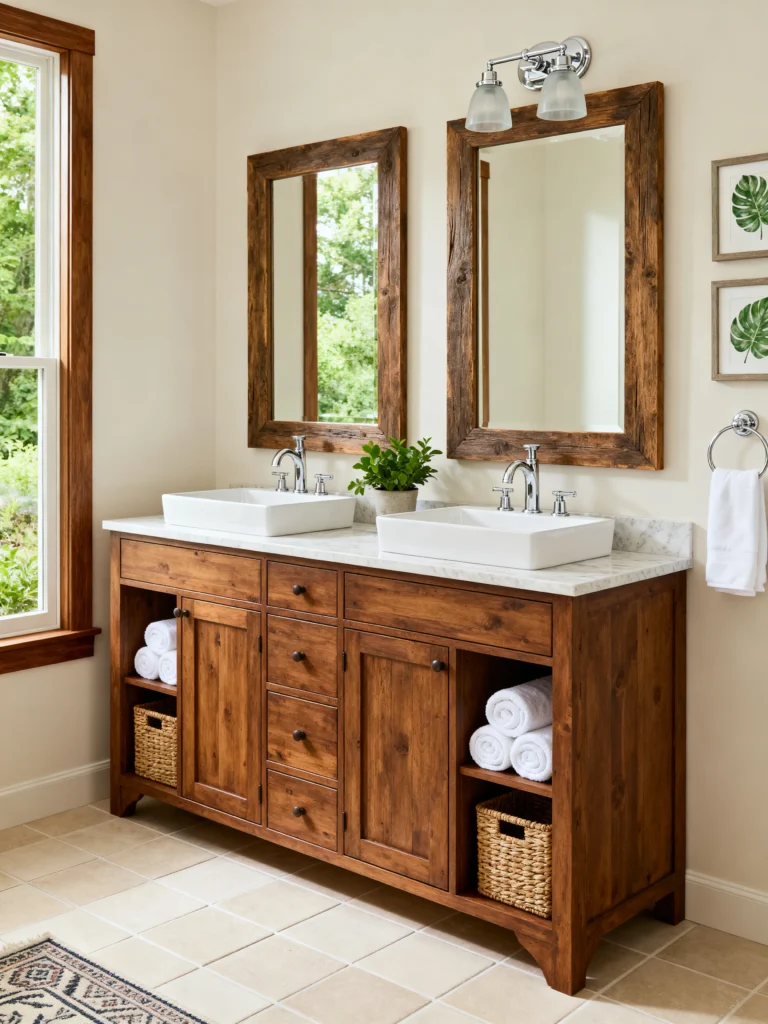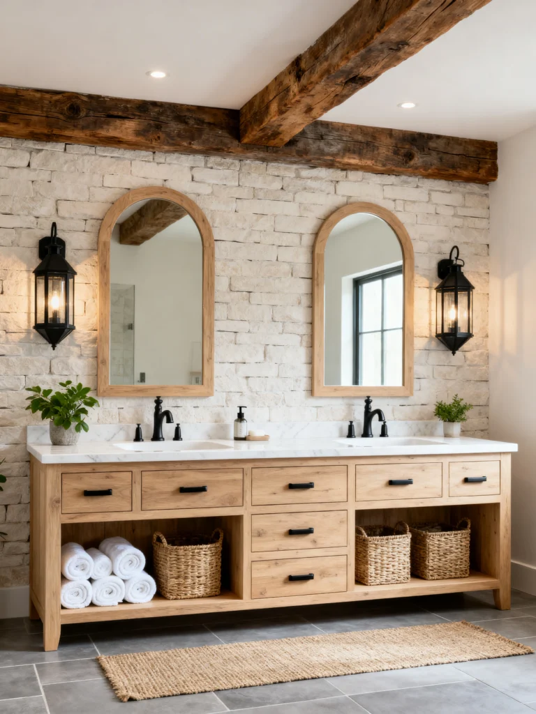 What I love most here is the balance. You have these two separate, tall mirrors that elongate the wall, and the white marble top keeps the dark wood from feeling too heavy. It’s classic, functional, and has that “modern farmhouse” soul that never really goes out of style.