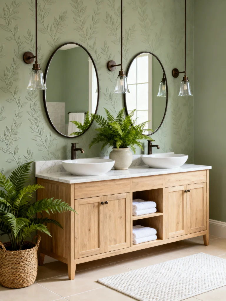 Can we talk about this wallpaper? The subtle leaf pattern against that sage green background is a total mood. This bathroom feels like a secret garden. The vanity itself is a light, airy wood that lets the wall treatments do the talking.