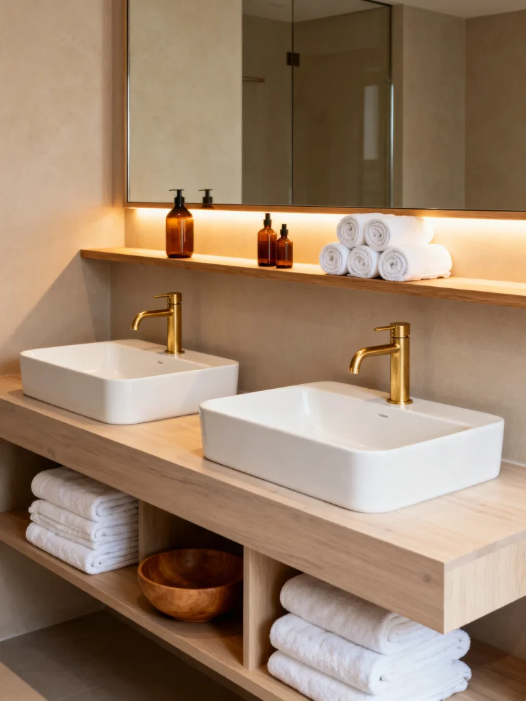 This is minimalist luxury at its finest. There’s no bulky cabinet here—just a thick, floating wooden slab that makes the room feel massive. But the real stars? Those gold faucets. They pop so beautifully against the neutral, sandy tones of the walls.