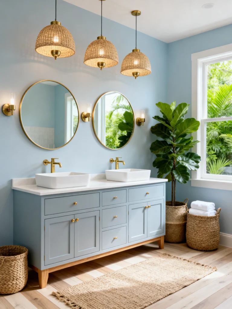 This one feels like a vacation. That dusty blue vanity is such a refreshing break from the usual wood or white options. Paired with the wicker pendant lights and the giant fiddle leaf fig in the corner, it’s got a major tropical-modern vibe.