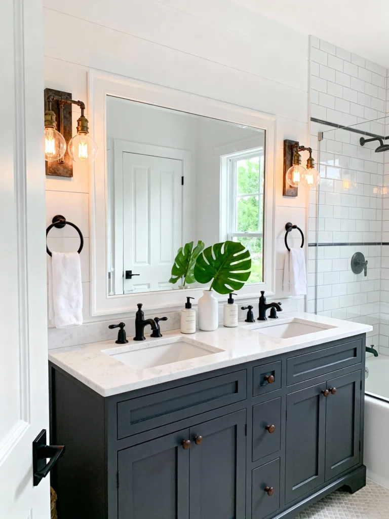 This one feels like a breath of fresh air. It has that perfect “modern farmhouse” or coastal vibe with the white shiplap walls and the dark, moody charcoal vanity. The contrast is sharp but soothing.