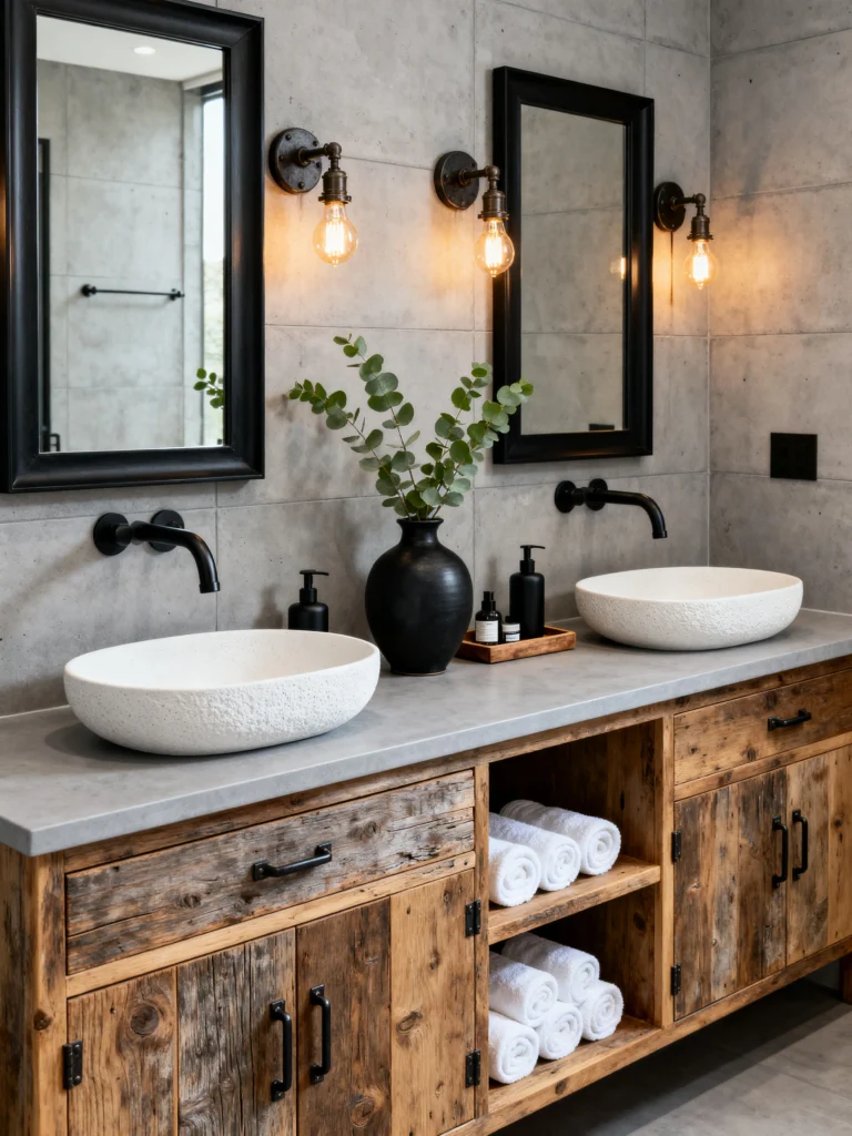 The reclaimed wood vanity is the star here—it’s full of knots and character, which warms up the “coldness” of the concrete. Those vessel sinks look like hand-carved stone bowls, and the wall-mounted black faucets keep the counter space totally clear. It’s rugged, masculine, and very cool.