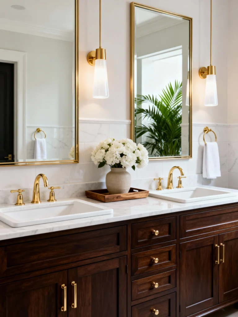 The long, rectangular mirrors and the sleek, frosted pendant lights keep the look modern. It’s a great example of how you can use traditional materials (dark wood and marble) but style them in a way that feels 100% current.