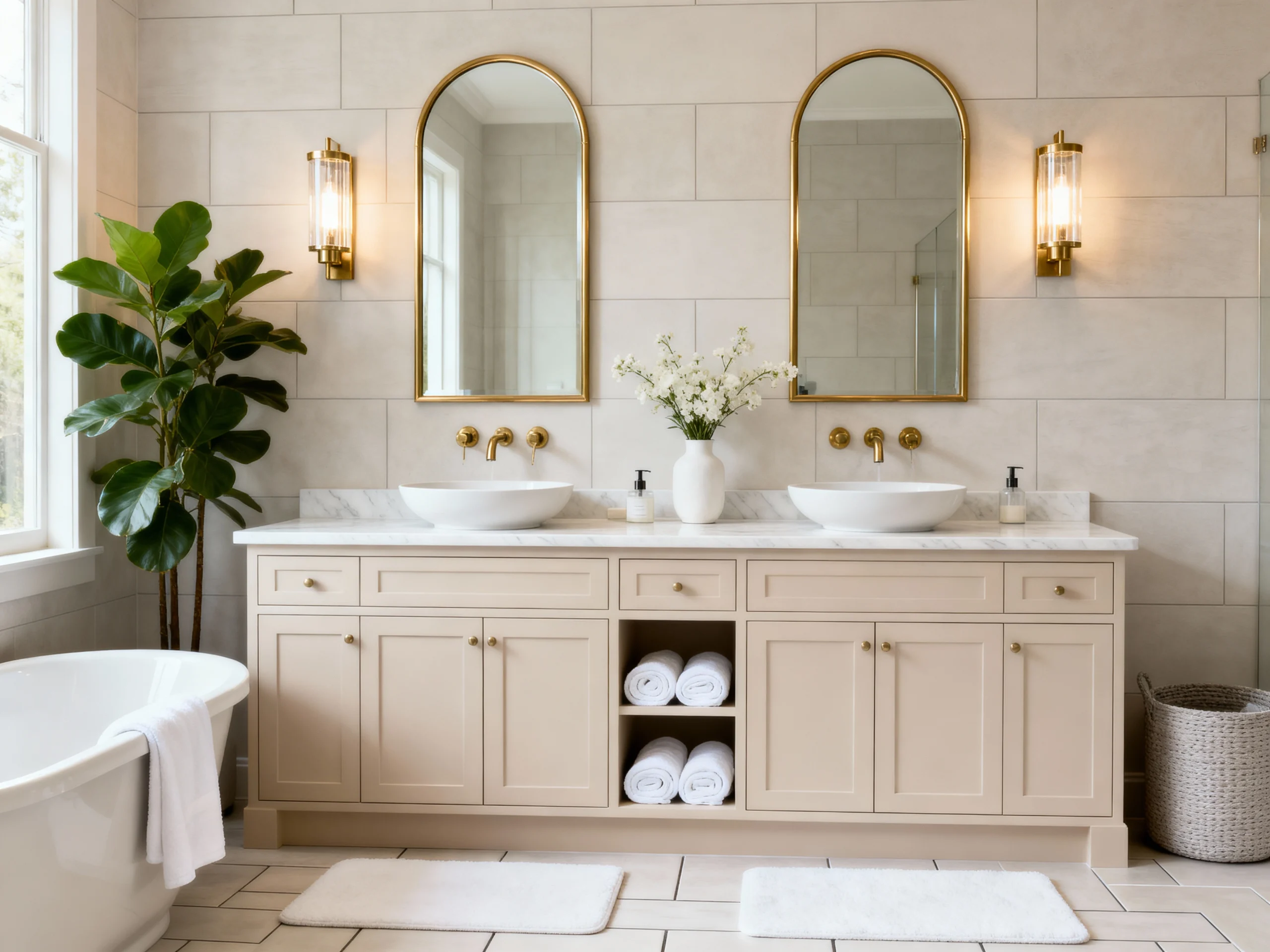 If you’re a fan of mixing “old-world charm” with “modern clean,” this one is for you. The first thing that catches your eye is those gorgeous arched mirrors. They add so much height to the room and make it feel almost like a high-end boutique hotel.