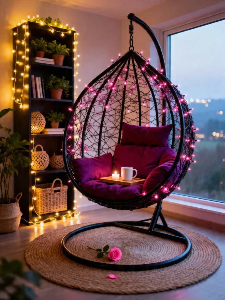 What I love most here is the intentionality of the lighting. You’ve got the warm, amber glow from the shelf-bound lanterns and the soft neon-pink pop from the chair. It creates this layered depth that makes a room feel expensive but cozy. That egg chair is the real MVP—it’s like a hug in furniture form. Notice how the jute rug adds a bit of “earthy” texture so the room doesn’t feel too artificial. If you’re looking to recreate this, don’t be afraid to mix your light temperatures. Those yellow “warm” bulbs next to the pink strings create a sunset effect that’s just magic. It’s the ultimate spot to decompress after a long day of being a human.