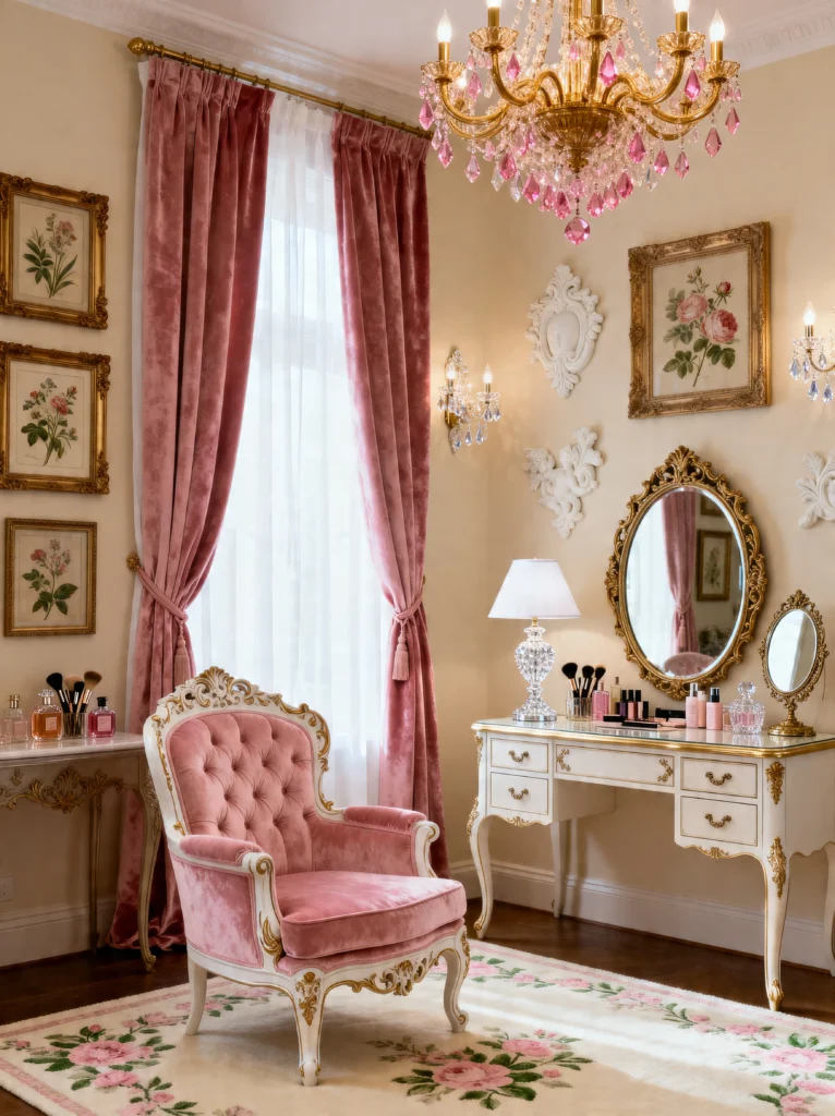 This space is the perfect mix of French Provincial and high-glam maximalism. That velvet tufted chair in dusty rose is a total showstopper, but it’s the gold-framed botanical prints and that pink crystal chandelier that really tie the “Regency Core” look together.