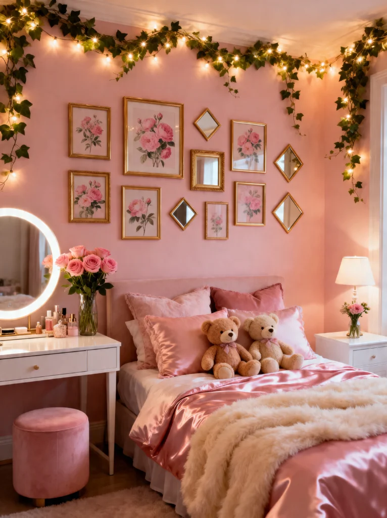 If you’re working with a smaller space, notice how the round, backlit mirror adds a modern touch that balances out the traditional floral art. It’s all about the textures here—satin pillowcases, a faux-fur throw, and those adorable teddy bears. It’s the ultimate “cozy girl” aesthetic.