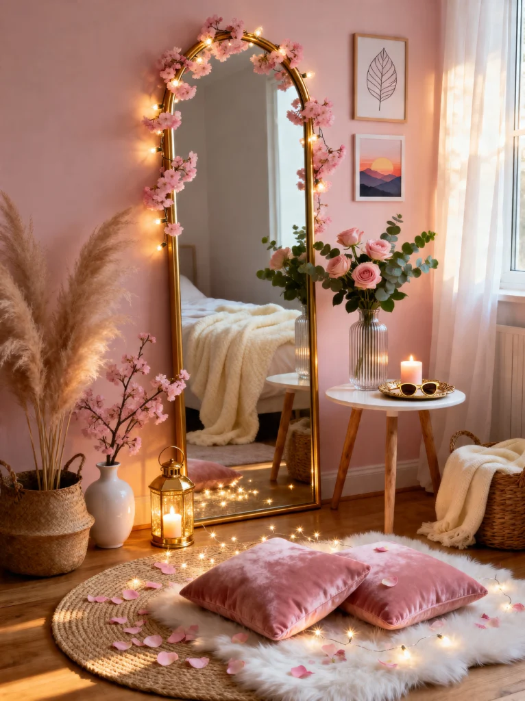 Sometimes you don’t need a whole room makeover; you just need one perfect corner. This “mirror moment” is everything. By wrapping an arched floor mirror in cherry blossom vines and fairy lights, you create a focal point that makes the room feel twice as big and ten times as magical.