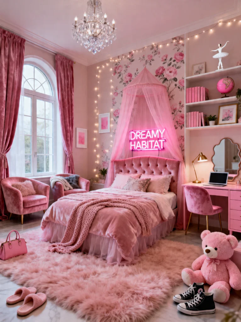 Okay, if you want a room that makes a statement, this is it. We’re leaning into Hyper-Feminine Maximalism here. The “Dreamy Habitat” neon sign is obviously the star of the show, but look at how it plays off the floral wallpaper and the pink tulle canopy. It’s bold, it’s bright, and it’s unashamedly pink.