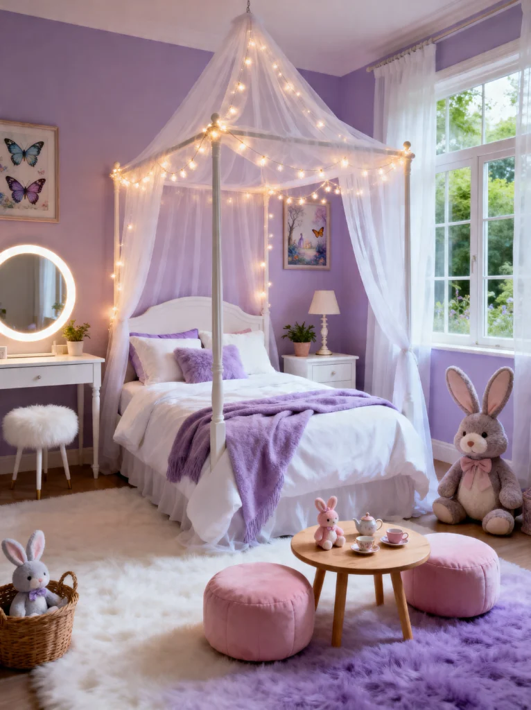 Let’s pivot slightly! While pink is usually the hero, this room shows how Lavender and Lilac can create a serene, ethereal vibe. This feels very “Fairytale Core.” The four-poster bed with the sheer canopy and globe lights creates a literal cocoon. It’s soft, it’s airy, and it feels like sleeping in a cloud.