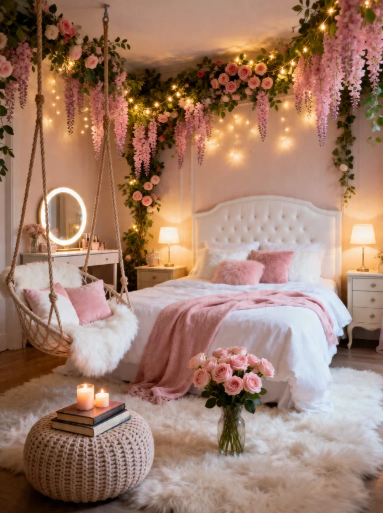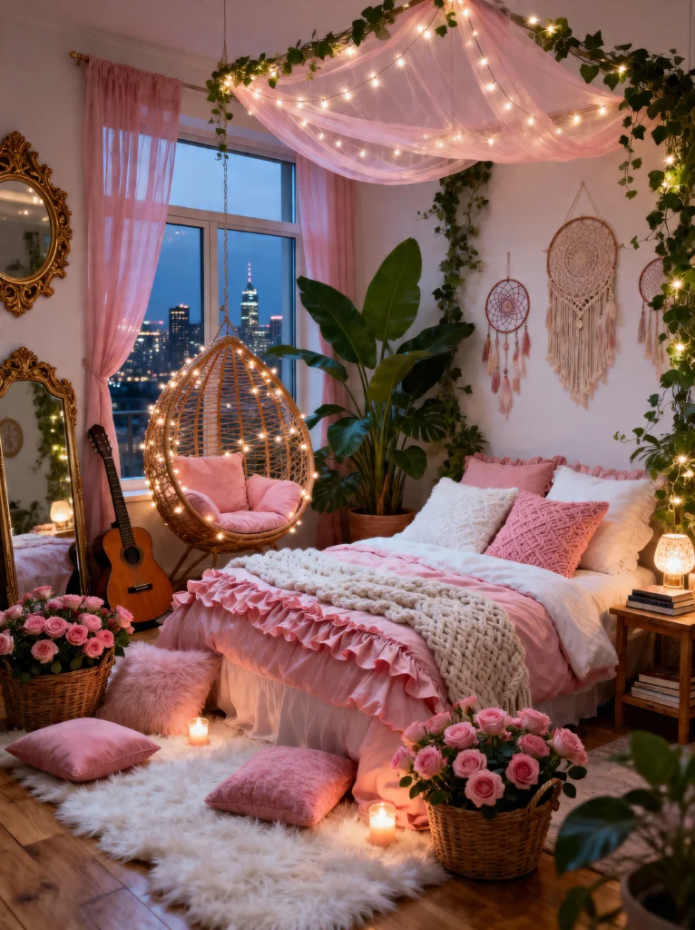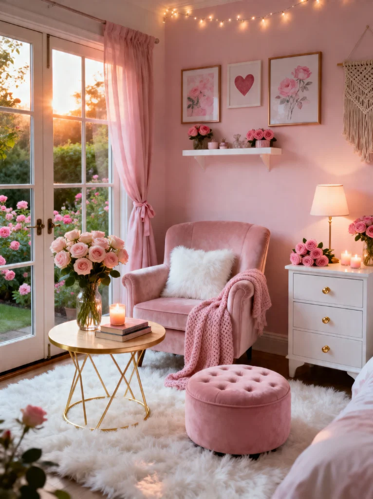 The key to making this work without it looking like a flower shop exploded is the balance of textures. You’ve got the chunky knit pink throw (which looks soft enough to live in), the shaggy faux-fur rug, and the delicate sheer curtains. It’s a sensory heaven. This setup is perfect for someone who loves a classic, “girly” aesthetic but wants to keep it feeling sophisticated. Pro tip: if you’re doing the rose-petal-on-the-floor look for a photo op, just remember you’ll have to vacuum them up later! But honestly, for a room that looks this much like a hug, it’s totally worth the effort.